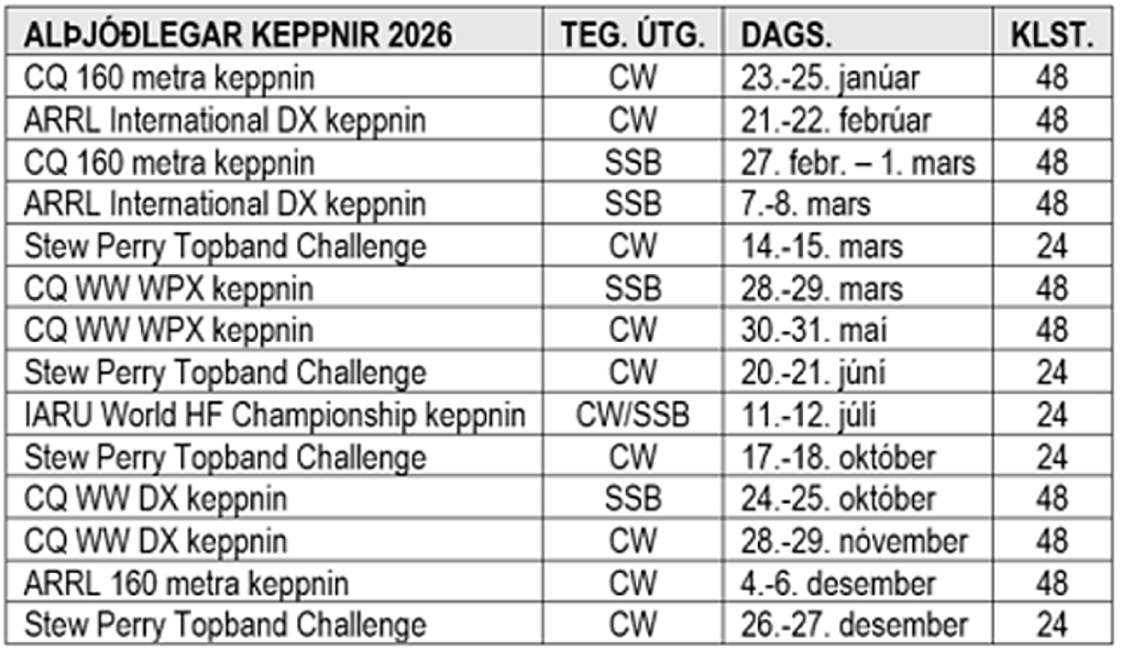 ÍRA barst jákvætt svar frá Fjarskiptastofu (FST) í dag, 3. febrúar við ósk félagsins um endurnýjun heimildar til notkunar tíðnisviðsins 1850-1900 kHz á auknu afli vegna þátttöku í tilgreindum alþjóðlegum keppnum á almanaksárinu 2026. Sjá meðfylgjandi töflu neðar. G-leyfishafar hafa heimild til að nota fullt afl, eða allt að 1kW á tíðnisviðnu 1850-1900 kHz.