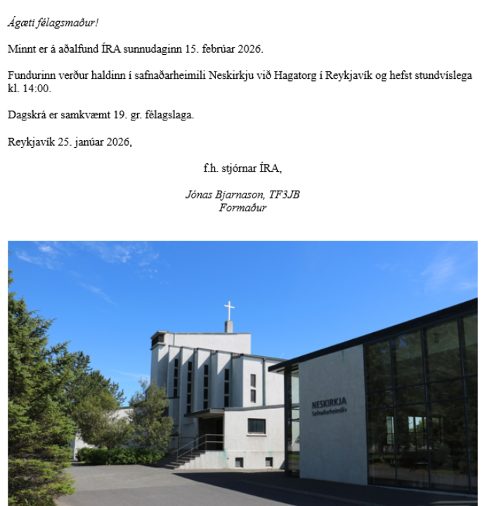 Minnt er á aðalfund ÍRA sunnudaginn 15. febrúar 2026.